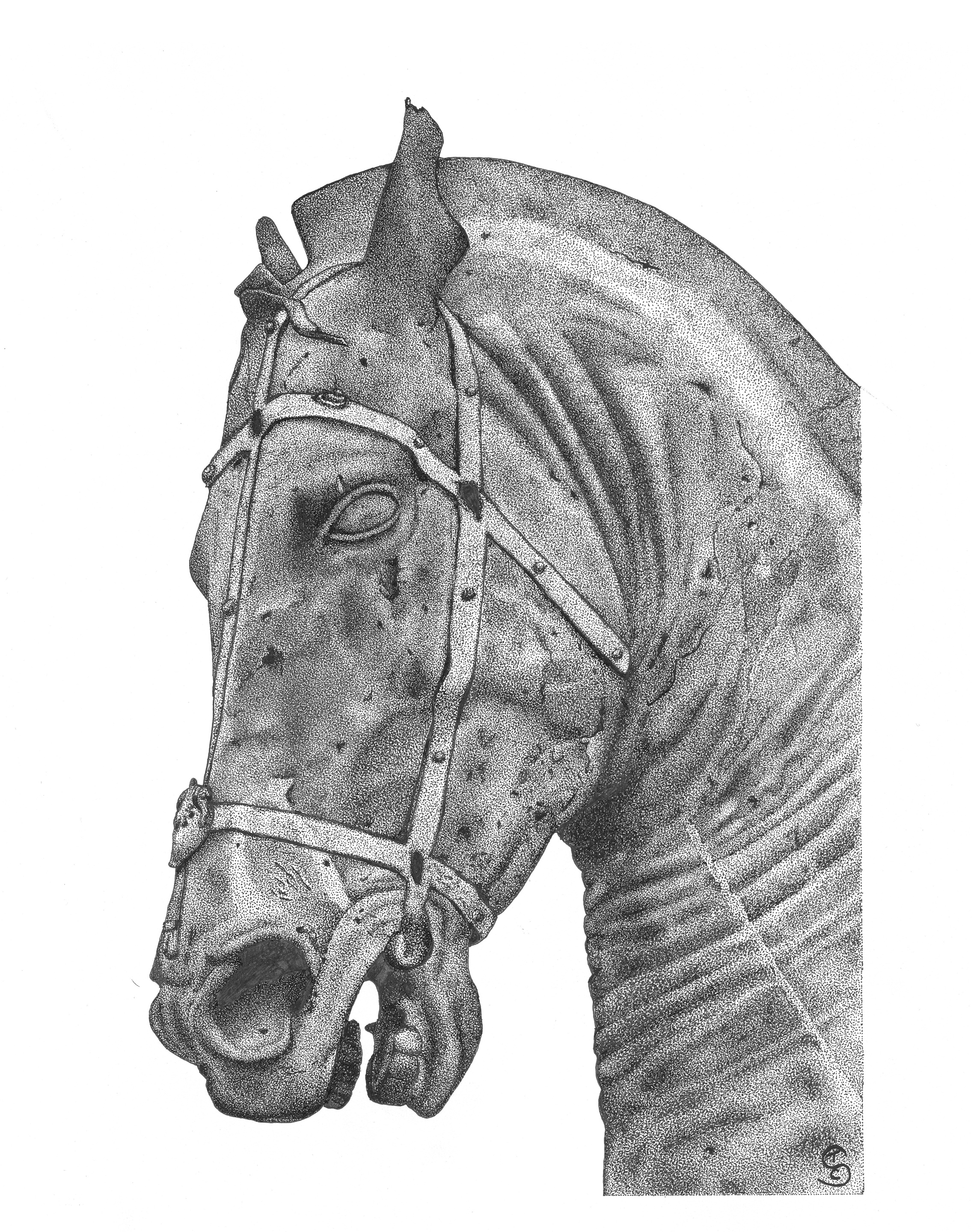 Having grown up in England “surrounded by history and archaeology,” Carter’s path to creative practice was both inevitable and hard-won. “I was always told off for drawing horses at school,” she recalls with a smile. “Back then, archaeology wasn’t considered a career for a girl, so I set it aside, even though I loved history and the past.” Years later, while creating illustrations for her book Hijacked Archaeology: Arthurian Fact or Fiction? Carter rediscovered her artistic voice. When she couldn’t find suitable, copyright-free images, she drew them herself, and in doing so, reignited a lifelong passion.