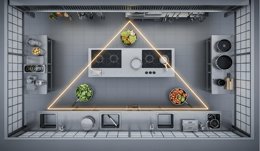 The Golden Triangle refers to the optimal arrangement of three key work zones in a kitchen: the cooking area, the cleaning area, and the storage area. In a domestic kitchen, this usually translates to the stove, sink, and fridge. In a commercial setting, the principle still applies—just on a larger, more industrial scale.