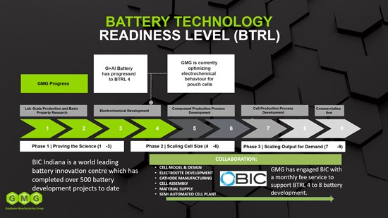 The battery technology readiness level ("BTRL") of the G+AI technology remains at Level 4, see Figure 5. GMG is currently optimizing electrochemical behaviour for pouch cells via ongoing laboratory experimentation. Through collaboration with BIC, it is anticipated that the battery technology readiness will progress to BTRL 7 and 8 since the equipment and processes needed to produce the G+AI batteries are the same as those employed to make Lithium-Ion Batteries.