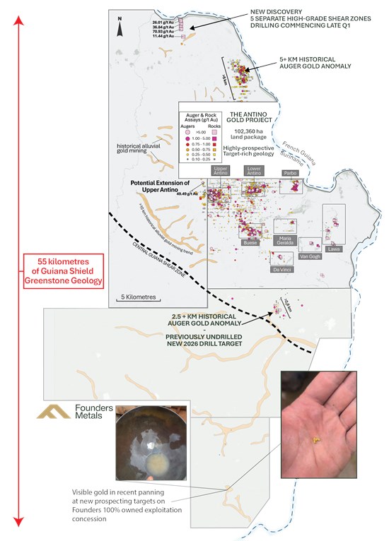 On January 13, 2026, the Suriname Ministry of Natural Resources (GMD No. 669/25) granted Lawa Gold N.V. a three-year exploration right for gold and other minerals covering 36,360 ha in the District of Sipaliwini. The concession is contiguous with and immediately adjacent to the existing Antino Gold Project. Founders currently holds a 70% interest in Lawa Gold N.V. pursuant to its option agreement with Nana Resources N.V.