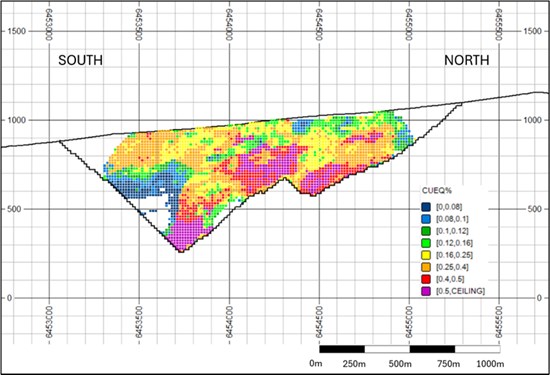 Figure 2: Cross-Section of East 348000 Looking West of the Block Model Showing the Distribution of Equivalent Copper Grade Within the Optimized 120 kt/d Pit Shell Outline (UTM Zone 9N [NAD 83])
