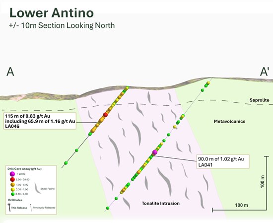 The Company reports assay results from eight diamond drill holes (LA043 to LA050) at the Lower Antino target, located approximately 3.5 km east of the Upper Antino deposit (Figure 1). All eight holes intersected gold mineralization, with results highlighted by 65.9 m of 1.16 g/t Au within 115.0 m of 0.83 g/t Au in LA046 (Table 1). The 115-metre intercept in LA046 begins at surface and represents an up-dip expansion of the previously released 90.0 m of 1.02 g/t Au in LA041, confirming the continuity and growth potential of the mineralized zone.