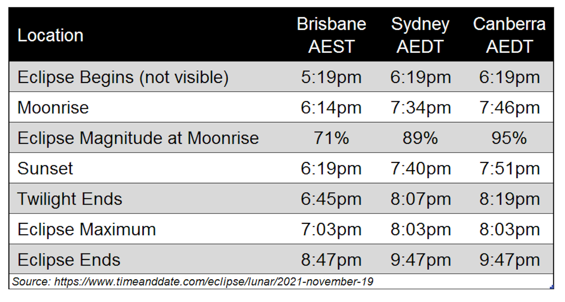 In Brisbane, Sydney and Canberra, the Moon will rise before the eclipse reaches its maximum. Brisbane will have the best view of all the capital cities, as the sky will have darkened and the Moon will be fairly high by the time of maximum eclipse.