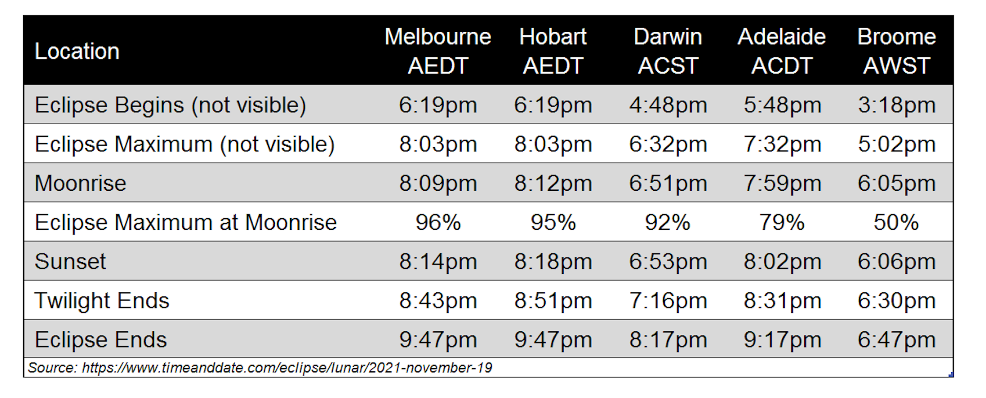 As the eclipse occurs at moonrise for viewers in Australia, your location (latitude and longitude) will determine when you will see the Moon appear above the horizon. It’s a little uncertain exactly how much we’ll be able to make of the eclipse against the twilight sky but it’ll be interesting to see what happens.