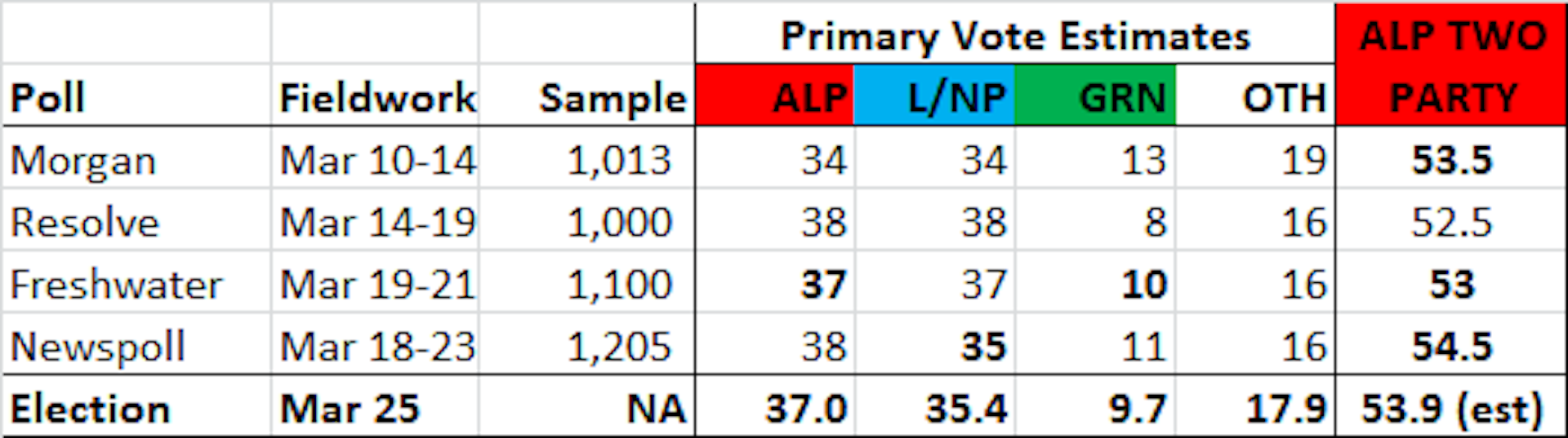 The table below compares the polls taken during the final two weeks of the election campaign to the results. Each poll is listed with its fieldwork dates, sample size, primary vote estimates for Labor, the Coalition, the Greens and all Others, and Labor’s two party estimate.