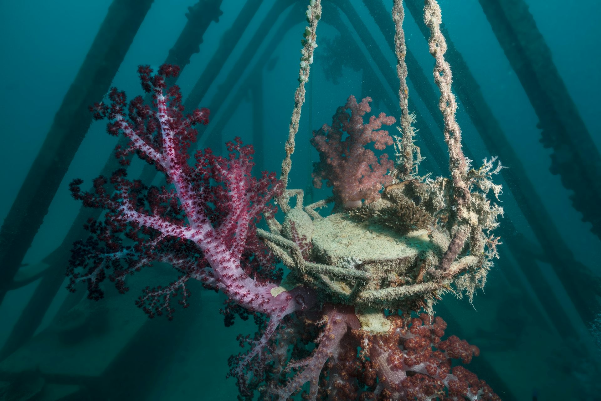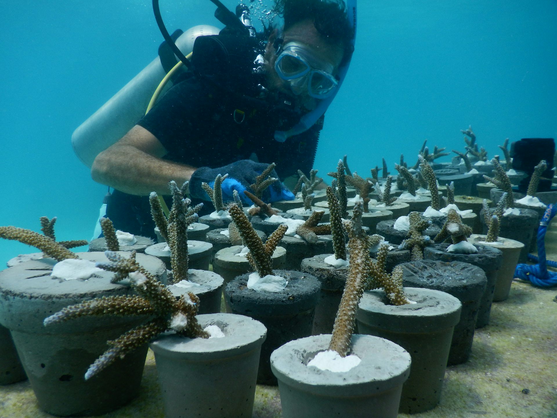 Coral gardening is a reef-restoration technique modelled on terrestrial gardening. Small cuttings of coral colonies, called fragments, are transplanted from the surrounding reef to populate the new artificial reef. The corals help to rapidly transform the art installation into a biotic location.