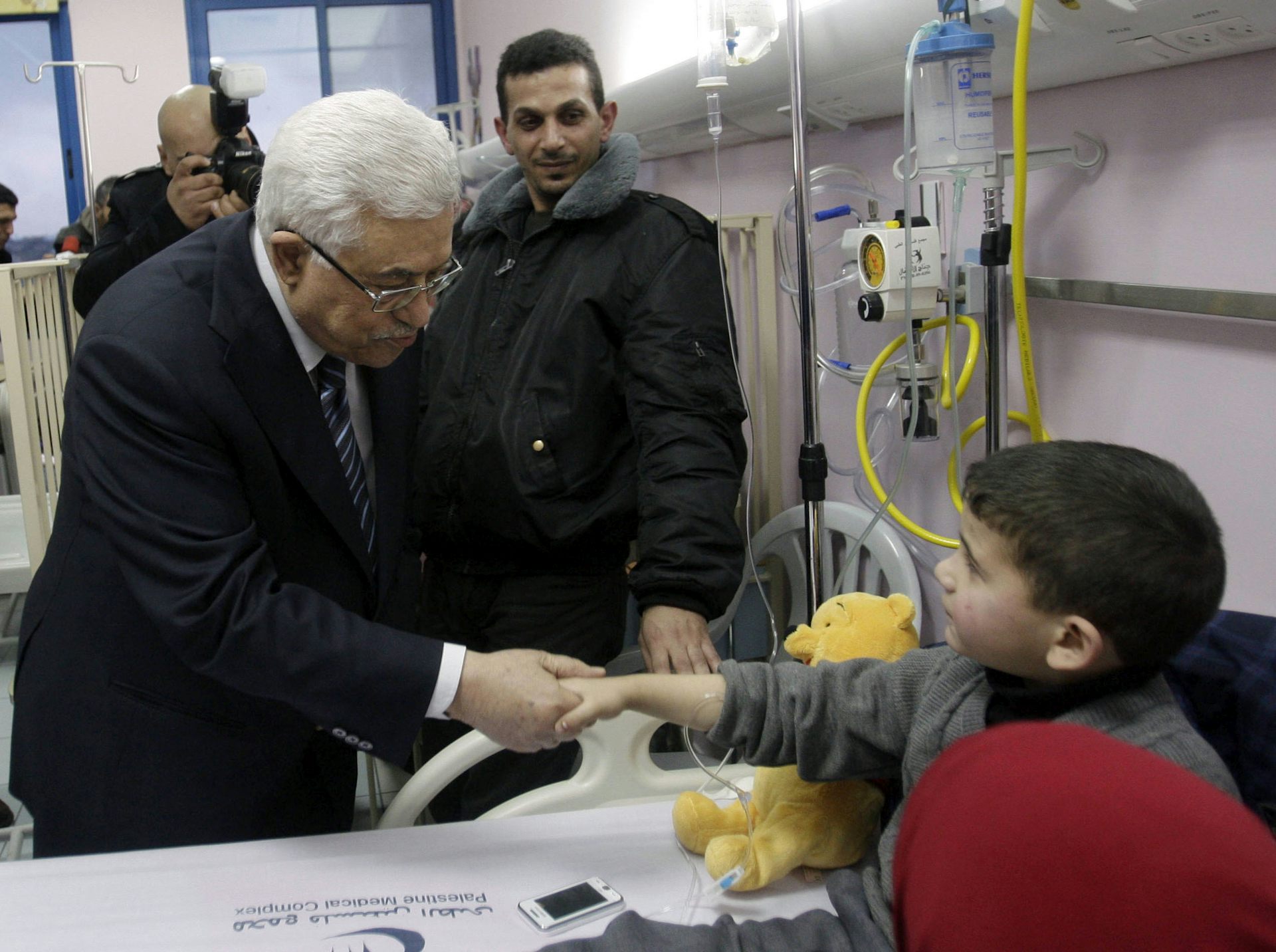 Palestinian President Mahmoud Abbas visits one of dozens of Palestinian schoolchildren injured in the 2012 Jaba road accident. Nasser Shiyoukhi/AAP