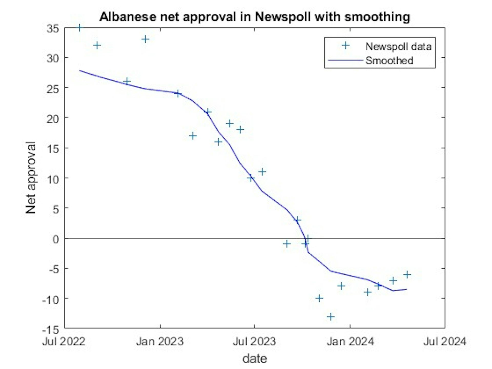 The graph below of Albanese’s net approval in Newspoll suggests his ratings are slowly improving. His low was -13 in late November, and he’s now at -6. In this graph, the Newspoll data are marked with plus signs, and a smoothed line has been fitted.