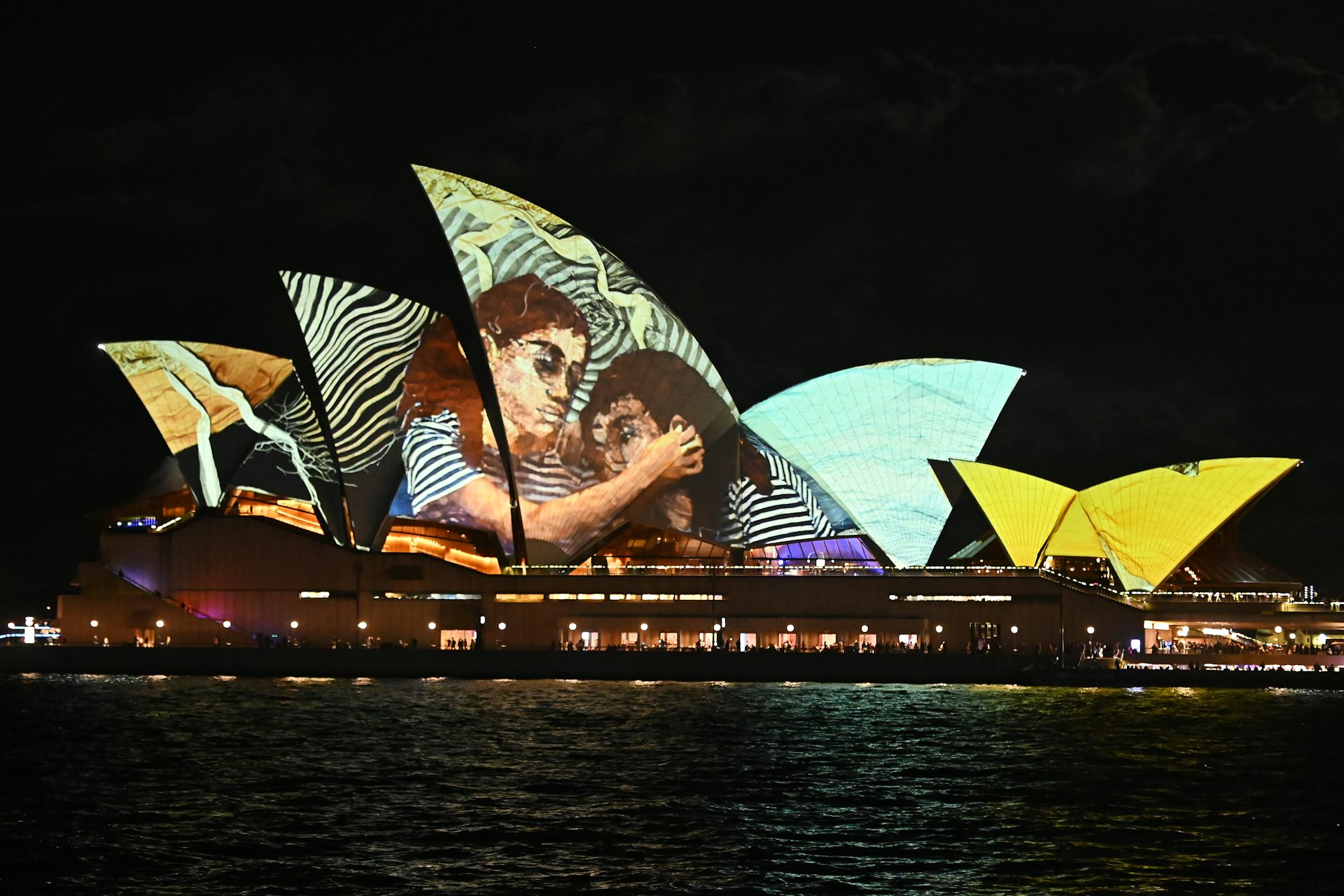 We also see First Nations artist Tori-Jay Mordey’s work, Faces of Change, on the pylons of Sydney Harbour Bridge. It explores, among other themes, humanity’s connection to nature and the threat that rising sea levels pose to the Torres Strait Islands.