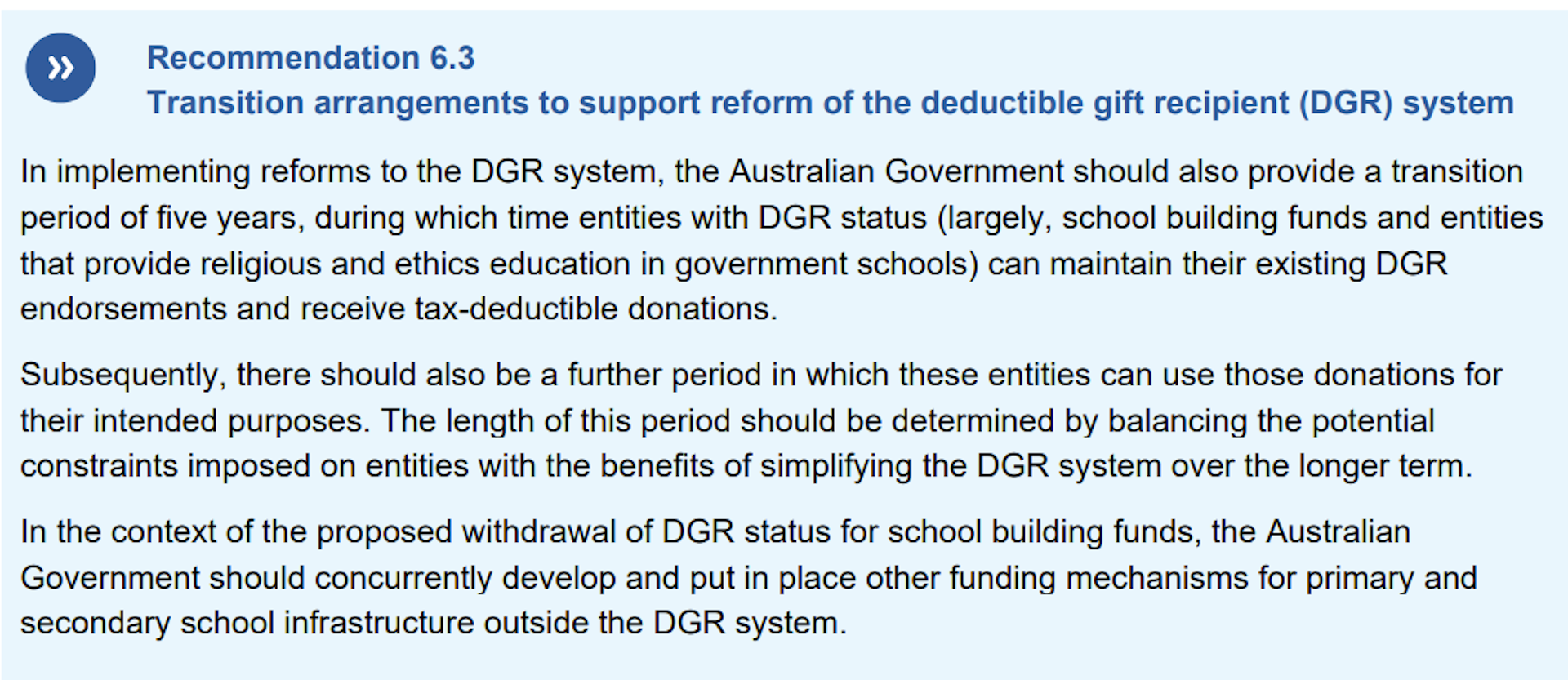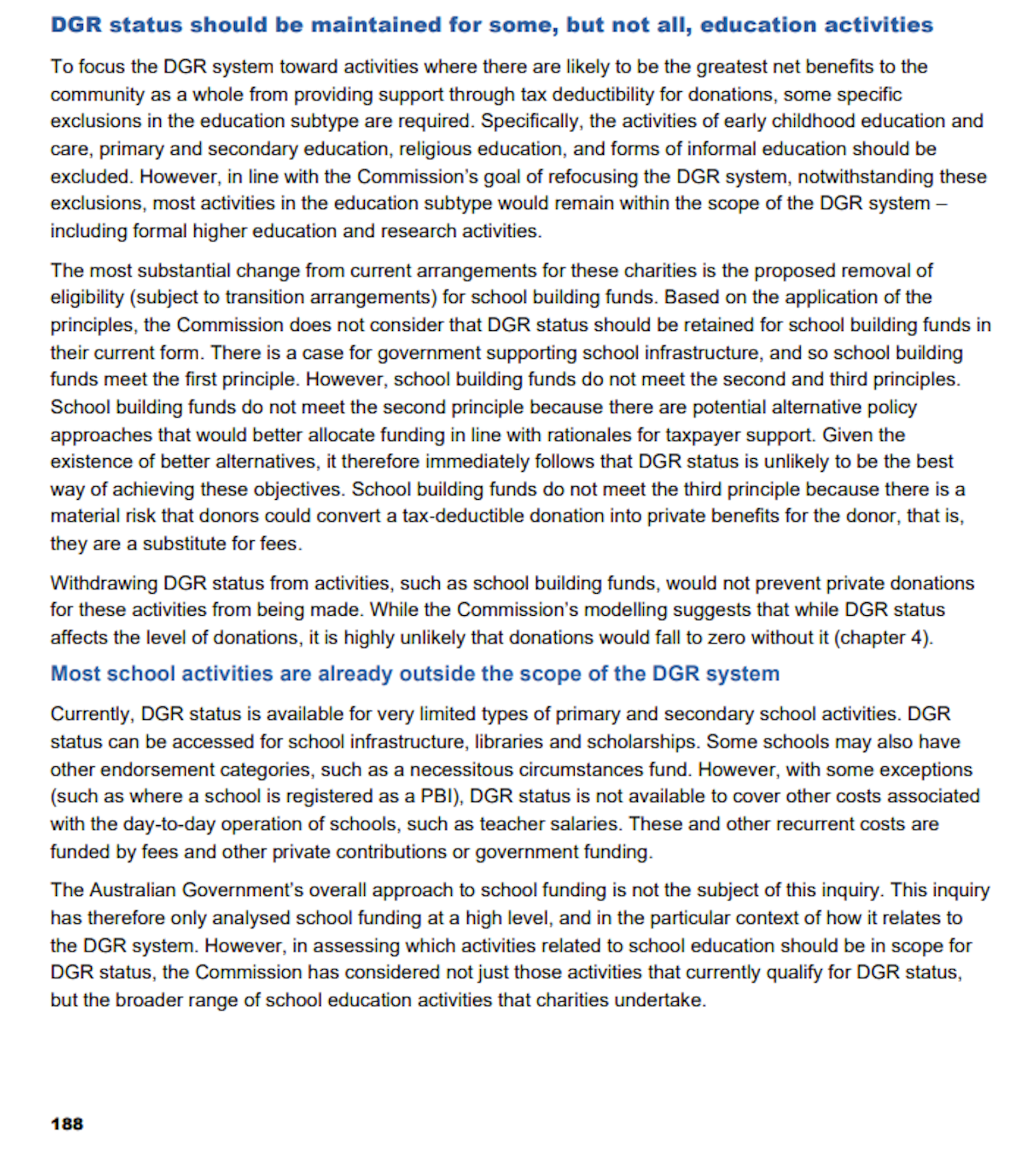 Using these principles, the Commission recommended that while many more charities should receive access to deductible gift recipient status, some should have their status withdrawn, among them school building funds.