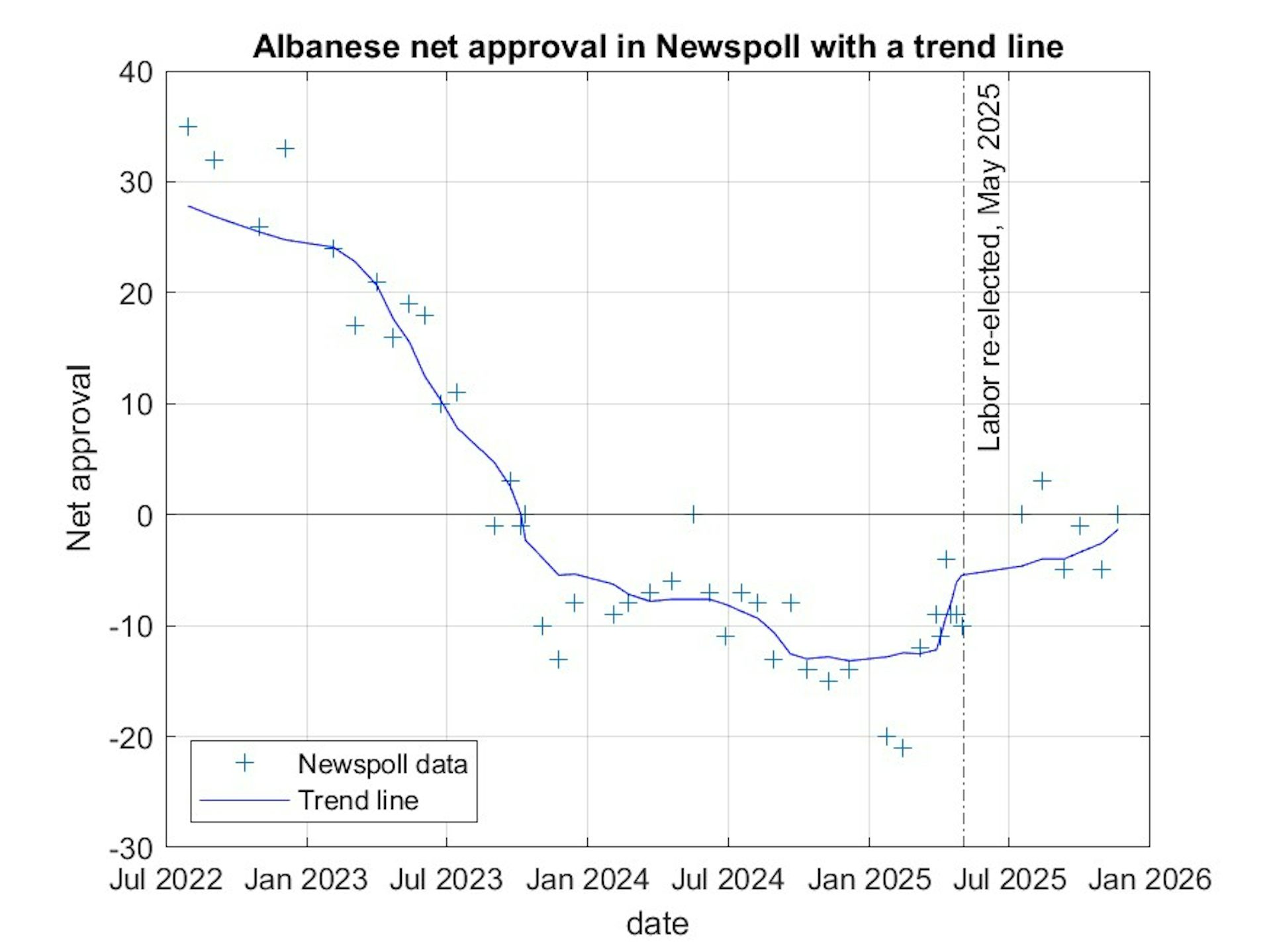 Anthony Albanese’s net approval improved five points to net zero, with 47% both satisfied and dissatisfied. Sussan Ley’s net approval improved four points to -29, rebounding slightly from a dive to -33. Albanese led Ley by an unchanged 54–27 as better PM.