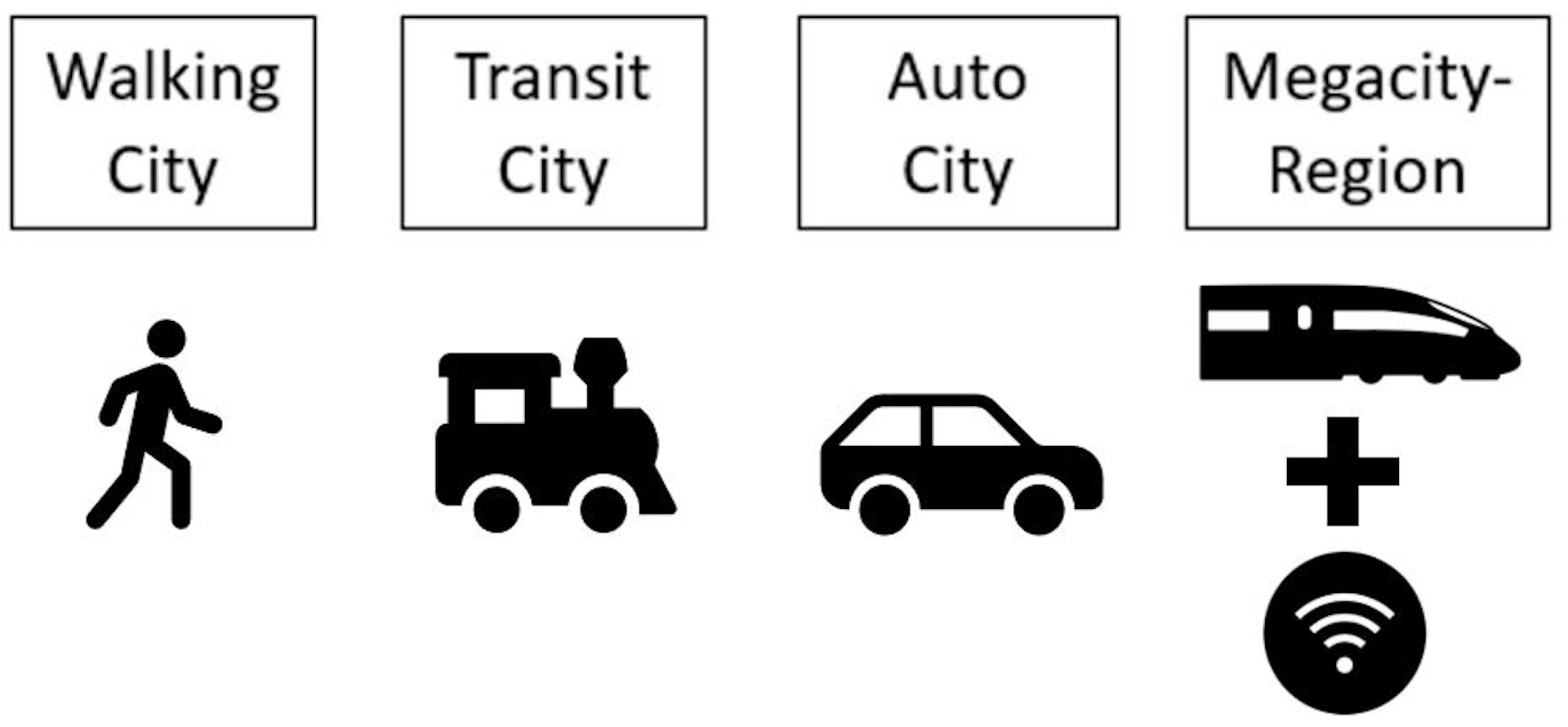 Settlement systems have evolved throughout history. Walking cities became rail-oriented cities, which became car-based cities. All these models in their day supported a daily return commute averaging one hour (Marchetti’s constant[25]).