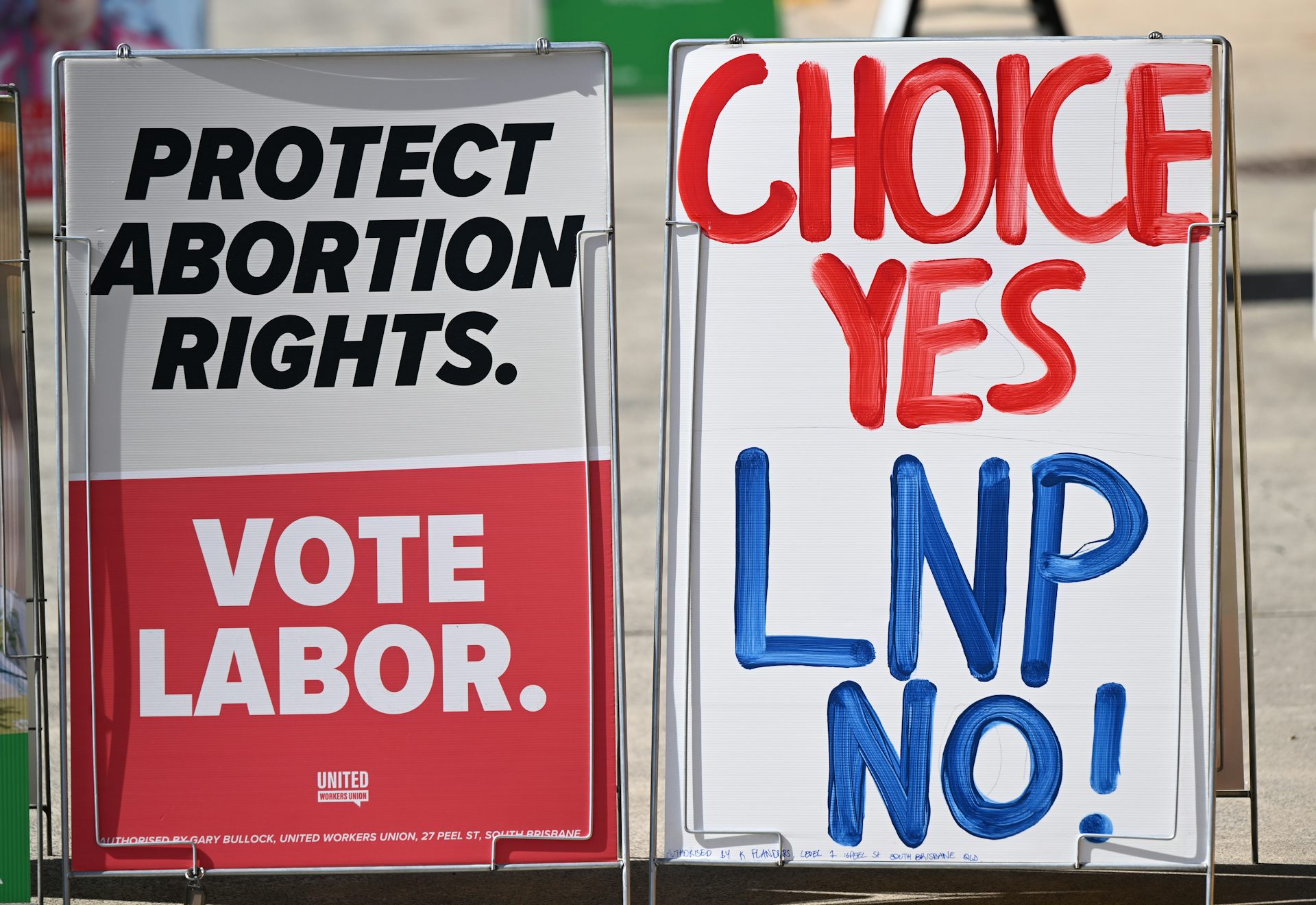 Two election signs, one saying protect abortion rights, vote Labor, the other saying choice yes, LNP no. Abortion has emerged as an election issue. Darren England/AAP[30]
