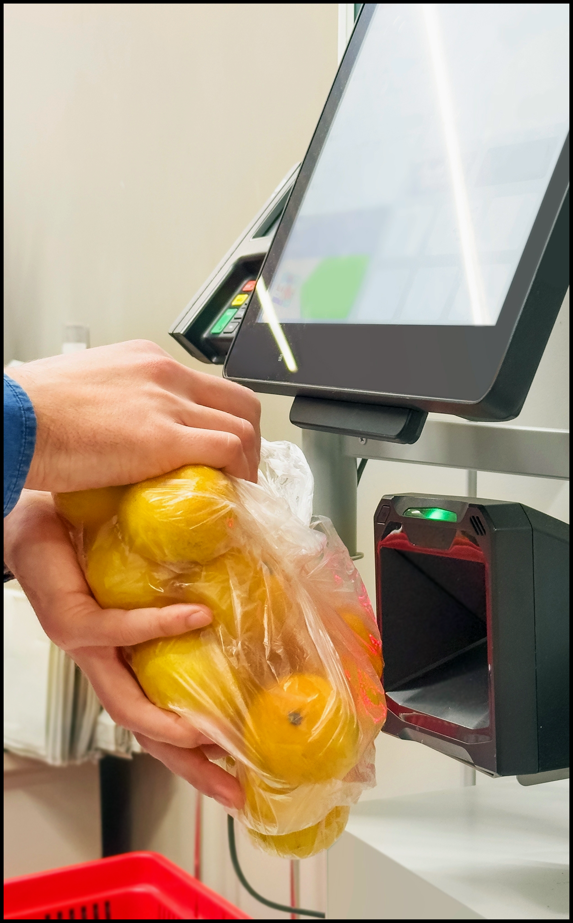 Customer pays his purchase at self service checkout