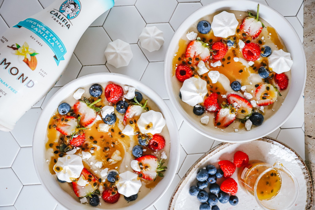 “These are a festive treat inspired by one of my absolute fave desserts - perfect for the summer holiday Season! Healthy enough for breakfast, but tasty enough for dessert! It’s thick, vegan and extra creamy!! Specifically, the addition of Califia Farms Unsweetened Vanilla Almond Milk is the hero ingredient in this dairy-free smoothie recipe, it makes the perfect body and base that combines the rest of the ingredients!”