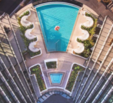 Each suite features premium bedding, private balconies and fully equipped kitchens, creating a comfortable environment that feels more like home than a traditional hotel stay. The resort’s elevated heated infinity pool, set high above Green Square, has also become a recognisable backdrop on screen, oƯering sweeping views across the city and surrounding suburbs.