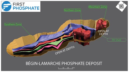 The Bégin-Lamarche Phosphate Deposit contains a significant phosphate Mineral Resource that is associated with well-defined oxide-apatite peridotite (OAP) intrusions within the large Lac-Saint-Jean anorthosite suite (LSJAS). The LSJAS is the largest anorthosite phosphate mineralized anorthosite worldwide. The phosphate deposit is comprised of three mineralized zones within the deposit. The three zones are continuous, only separated by faults within the deposit and extend to a length of 2,500 m (Figure 1). The Mountain Zone is a single phosphate-bearing mass having a diameter of up to 200 m and a length of 250 m. Drilling at the Mountain Zone intersected massive apatite (phosphate-bearing mineral) veins of up to 2 m. The Northern zone is comprised of two phosphate layers ranging from 100 to 200 m in thickness and a length of 600 m. The Southern Zone bears four phosphate layers, one of them having up to 200 m in thickness and extending to 1,700 m.