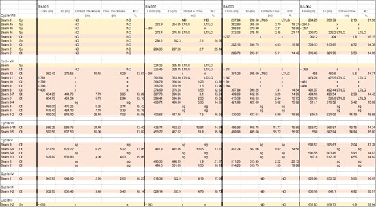 - Sylvinite: seam thickness has to be > 2 m and the Sylvite content > 16 %. Combined Sylvite/Carnallite seams (e.g., Cycle VIII seam 4 in Ba-003, Cycle VII seam 14 in Ba-002) have been considered as separate seams.