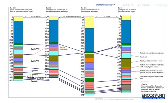 The flat-lying nature of the West African Evaporite Basin, confirmed in the project area by results from extensive seismic studies coupled with drillhole geological information, allows for extrapolation of the various cycles and seams over significant distances. The evaporite basin geology outlined in the stratigraphic columns in Figure 1 confirms continuity of potash seams over approximately 8,000m of strike length based on drill holes BA-001, BA-002, BA-003, and BA-004