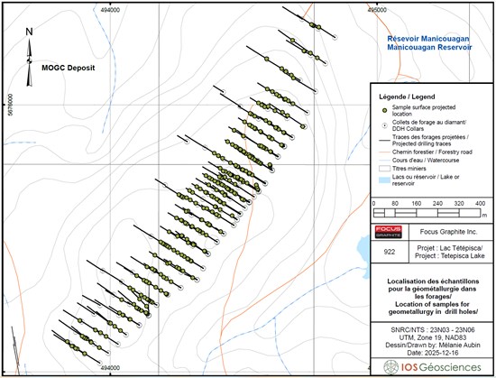The MOGC flake graphite deposit is part of the Company's Lac Tetepisca Project, located southwest of the Manicouagan Reservoir on the Nitassinan of the Pessamit Innu First Nation, in Quebec's Cote-Nord region. The MOGC is currently defined by a linear 1.5 km long segment of an 8 km long folded geophysical magnetic-electromagnetic anomaly that trends N035°. The April 4, 2022 NI 43-101 Technical Report, prepared by DRA America's Inc. ("DRA"), outlines a pit-constrained Indicated Resource of 59.3 million tonnes (Mt) grading 10.61% Graphitic Carbon (Cg) for an estimated content of 6.3 Mt of natural flake graphite (in situ), plus an Inferred Resource of 14.9 Mt grading 11.06% Cg for an estimated content of 1.6 Mt of natural flake graphite. This maiden resource predates all drilling completed in 2022. An updated MRE incorporating all 2022 drill holes is expected in late Q1 2026. This maiden resource estimate is available on www.sedarplus.ca/ on the Company's profile. As demonstrated in previous releases, the 2022 drill program extended the mineralization at depth and to the southwest, and now to the West limb.