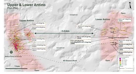 The Company reports assay results from eight diamond drill holes (LA043 to LA050) at the Lower Antino target, located approximately 3.5 km east of the Upper Antino deposit (Figure 1). All eight holes intersected gold mineralization, with results highlighted by 65.9 m of 1.16 g/t Au within 115.0 m of 0.83 g/t Au in LA046 (Table 1). The 115-metre intercept in LA046 begins at surface and represents an up-dip expansion of the previously released 90.0 m of 1.02 g/t Au in LA041, confirming the continuity and growth potential of the mineralized zone.