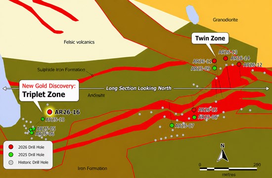 - Drill hole AR26-16 returned two gold zones from a broad 35.45m interval of sulphide-bearing iron formation and altered dacite, grading: